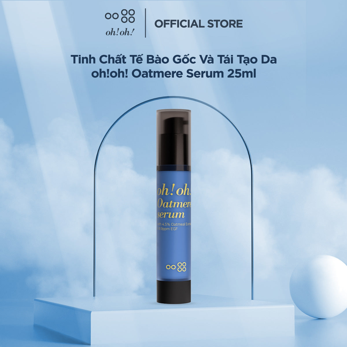 oh!oh! Oatmere Serum là tinh chất tế bào gốc, tái tạo da với công thức chứa 4.5% Oat Extract (chiết xuất yến mạch) làm dịu, chống viêm và chữa lành các tổn thương trên da, đồng thời bổ sung 9.9 ppm EGF (yếu tố tăng trưởng) cải thiện các nếp nhăn cũ và giảm sự xuất hiện nếp nhăn mới, kích thích sự phân bào của biểu bì và thúc đẩy sản sinh thêm Elastin, tái cấu trúc da. Tinh chất phù hợp với da tiền lão hóa, da nhạy cảm và da sau trị liệu hoặc can thiệp thẩm mỹ.